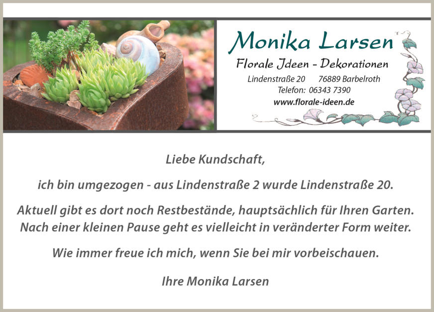 Monika Larsen  -  Florale Ideen & Dekorationen     Lindenstraße  20     .      76889 Barbelroth      .     Telefon:  06343 7390
